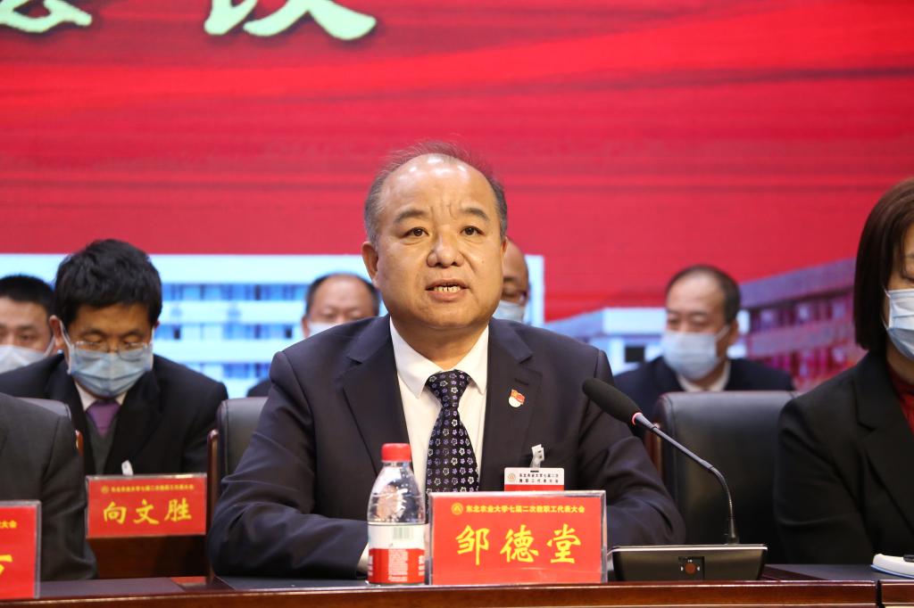 孙登林就落实本次会议精神提出五点意见。一是深化理论学习,用党的创新理论武装头脑。要认真学习贯彻习近平新时代中国特色社会主义思想,引领党员干部不断增强“四个意识”、坚定“四个自信”、做到“两个维护”。要坚持把理论学习与党史学习教育相结合,与庆祝建党100周年系列活动相结合,深刻认识中国共产党的伟大成就,做到学史明理、学史增信、学史崇德、学史力行。二是坚持党的领导,凝聚学校高质量发展的磅礴力量。要坚持党对学校事业的全面领导,全力推动基层党建工作。坚持党建工作与学校中心工作深度融合、同频共振,围绕龙江农业农村现代化建设,聚焦制约农业发展的关键技术,进一步发挥学校优势、强化世界一流学科和高水平大学建设的突出作用。三是推进民主政治建设,充分发挥“主人翁”精神。要充分发挥教代会民主激励、民主参与、民主监督、民主评议的作用,推动学校依法治校、民主治校进程。充分发挥广大教职工的“主人翁”精神,立足岗位、履职尽责,把个人理想融入学校高质量发展的进程中,积极参与学校民主管理和民主监督,持续推动学校改革发展。四是改进工作作风,高质量推动工作落实。要进一步贯彻落实“实施品牌战略,打造团队精神,采用紧逼战术”的治校新理念,巩固学校“深化作风整顿、优化办学育人环境”工作成效,从严、从细、从实推动作风建设。五是推动全面从严治党,切实营造风清气正的政治生态。要充分认识全面从严治党的重大意义,进一步强化责任担当,落实全面从严治党各项工作部署。