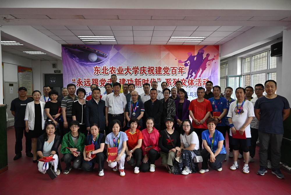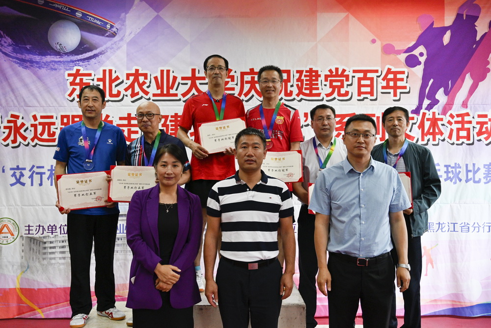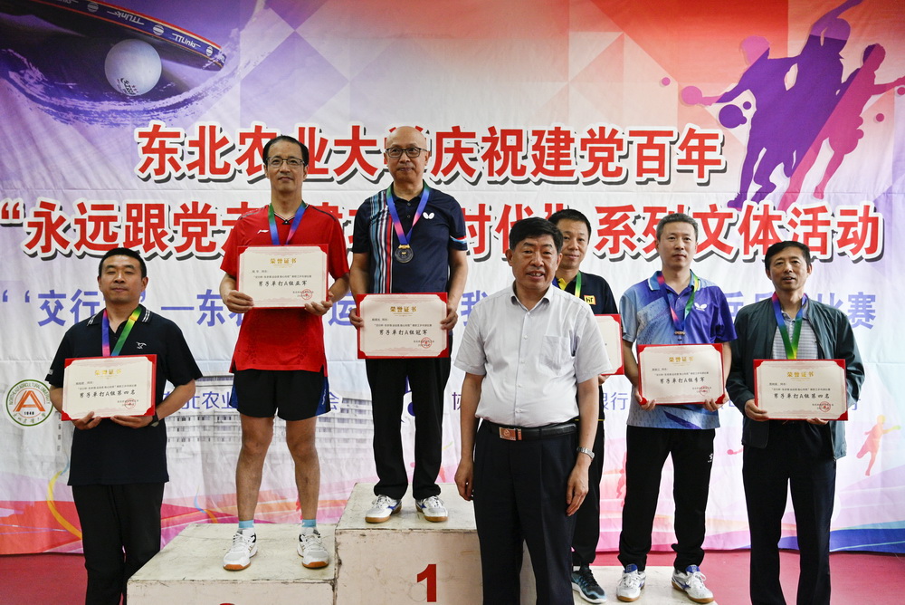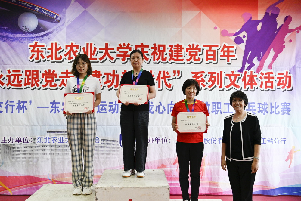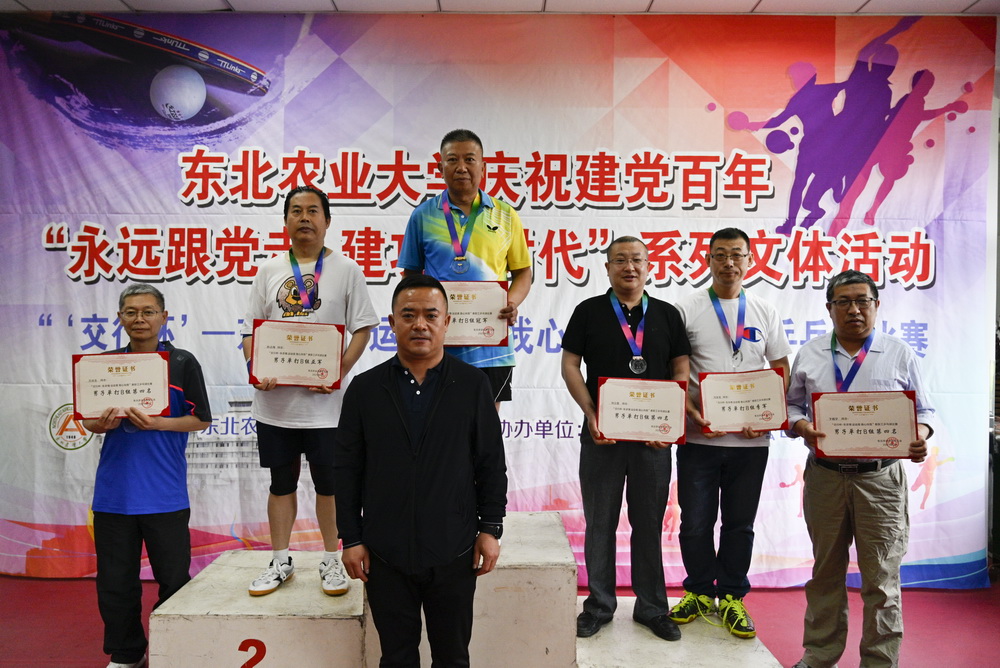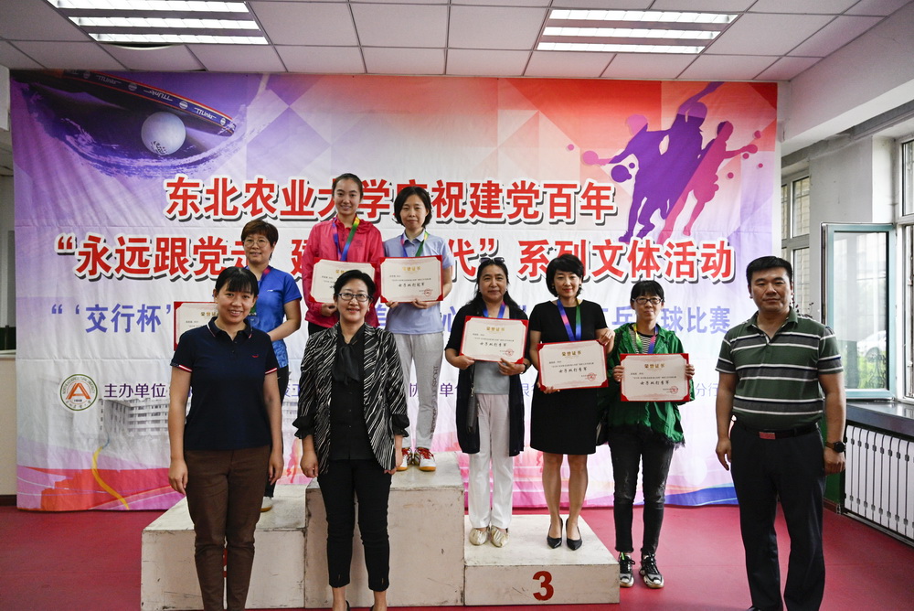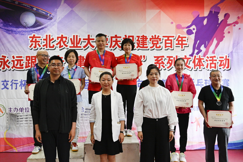 为进一步丰富活跃教职工文化生活,增强教职工体质和素养,增强广大教工的凝聚力和向心力,激励大家以更加昂扬的斗志、更加旺盛的精力、更加饱满精神的状态投入到学校建设各项事业中去,以优异成绩迎接建党100周年,由校工会主办举行了庆祝建党百年“永远跟党走、建功新时代”系列文体活动,首先开启教职工乒乓球比赛。6月9日,在学校主楼一楼教职工之家,“‘交行杯’-东农情运动美我心向党”教职工乒乓球比赛进行了各单项决赛。赛后,我校举办了此次比赛的颁奖仪式,校党委副书记兼工会主席庞玉红出席,校工会和各基层工会主席,各参赛运动员、广大教职工观看了决赛,并参加了颁奖仪式。闭幕式由校工会副主席杨石穿主持。
