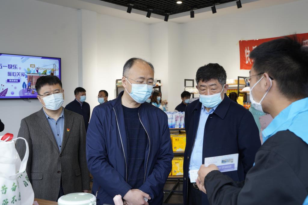 在音乐厅一楼大厅,付强向各学院驻校辅导员代表表示亲切慰问,他指出辅导员队伍是一支善于打仗,能打胜仗的队伍,并给大家的辛苦付出“点赞”,感谢大家在疫情防控期间克服种种困难、长期驻校坚守,落实学校党委疫情防控要求,切实把学生思想政治工作做到疫情防控的阵地上,为确保学生安全保驾护航。随后,一行人来到了易米阳光成长超市,对开展的“五一”节送温暖活动给予充分肯定,详细询问超市为困难学生服务情况,与困难学生亲切交流,了解生活学习情况,鼓励大家自立自强,学校永远是学生的坚强后盾。