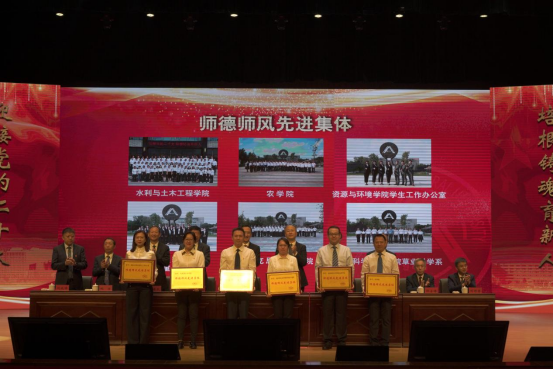 会上,校领导为“2021年全省高校师德先进集体”生命科学学院,“2020年全省高校师德先进集体”园艺园林学院,“2020年全省高校师德先进个人”付颖进行颁奖。