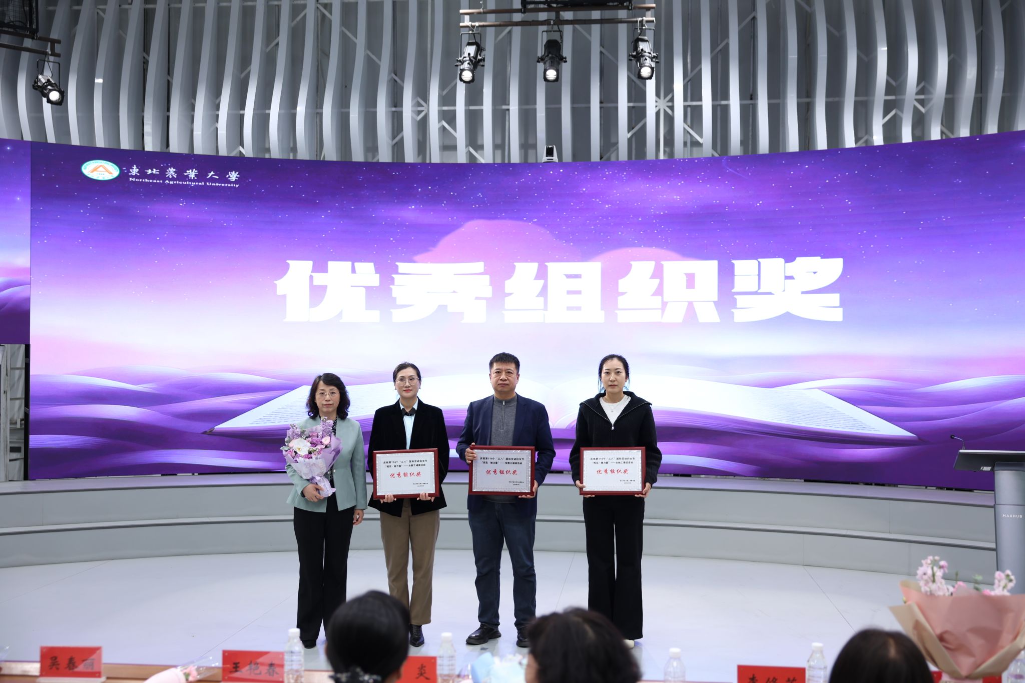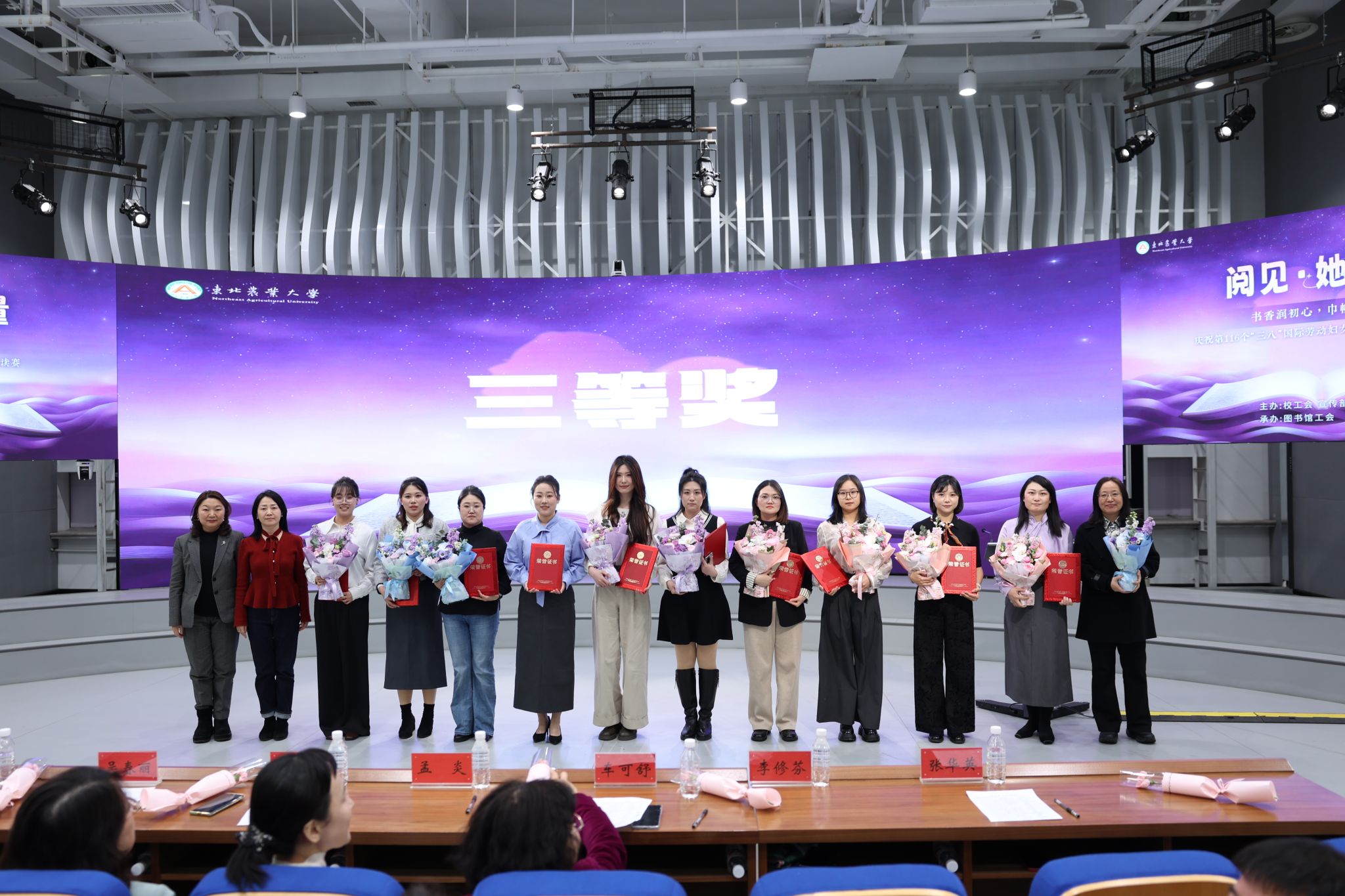 比赛现场,19名选手按照抽签顺序依次上台,结合自身教学科研、管理服务的工作实践,诵读经典篇目、分享阅读心得。她们之中既有一线教师、科研、教辅人员、辅导员,也有行政管理与后勤人员,她们以书为媒、以声传情,围绕“她力量”主题分享经典书籍与阅读感悟,展现了东农女性教职工的精神风貌与深厚的文化素养。经过激烈角逐,工程学院陈红宇、图书馆张铭、动物医学学院王馨笛获得一等奖,园艺园林学院仇冠琪、经济管理学院张雨彤、公共管理与法学院于明慧、农学院崔一凡、离退休工作处张帆、资源与环境学院燕思琪获得二等奖,机关姚雪、黑龙江省绿色食品科学研究院王佳懿、刘容旭、植物保护学院杨春博、李乃荟、图书馆张鹤凡、后勤管理处陈潇哲、艺术学院朱文婕、电气与信息学院王静、刘昕靓获得三等奖,图书馆、黑龙江省绿色食品科学研究院、电气与信息学院获优秀组织奖。校领导及评委为获奖选手和单位现场颁奖并合影留念。
