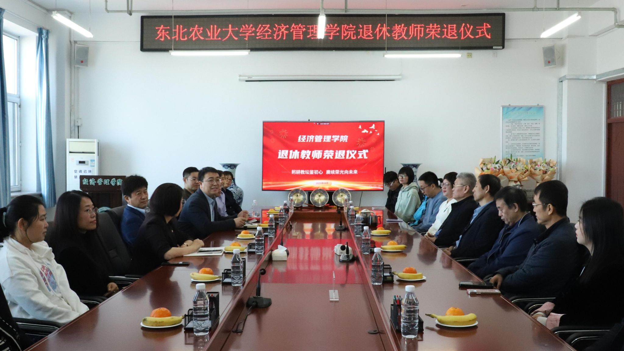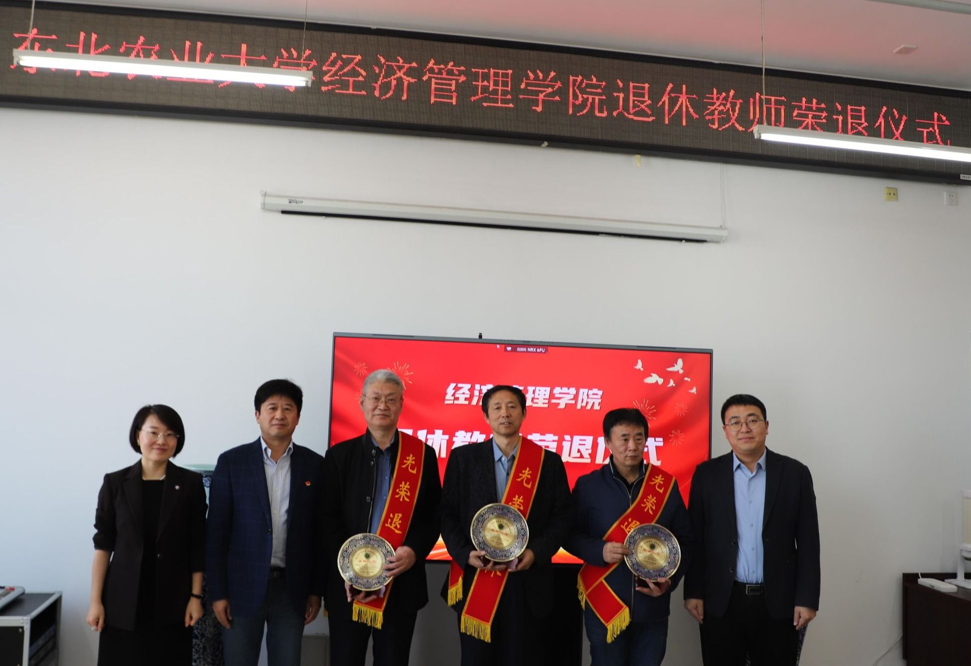 王洪亮对三位退休教师为学院发展作出的贡献给予了高度评价。他表示,三位退休教师的教育生涯,是学院发展历史的生动写照,是新时代高校教师精神风貌的生动体现,希望学院全体教职工以此次荣休仪式为契机,赓续精神血脉,凝聚奋进力量,为学院发展建设作出新贡献。会上,学院领导为三名退休教师颁发荣退纪念奖盘,学院青年教师为三名退休教师献上鲜花。