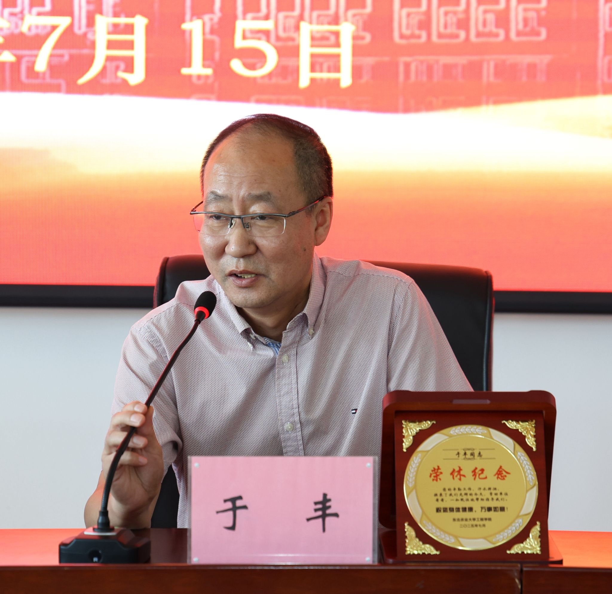窦大昶为两位教师颁发荣休纪念铭牌,孙培灵、于丰分别讲述了自己几十年的从教经历,并表达了对学校、学院的感恩之情以及对未来发展的美好祝福。