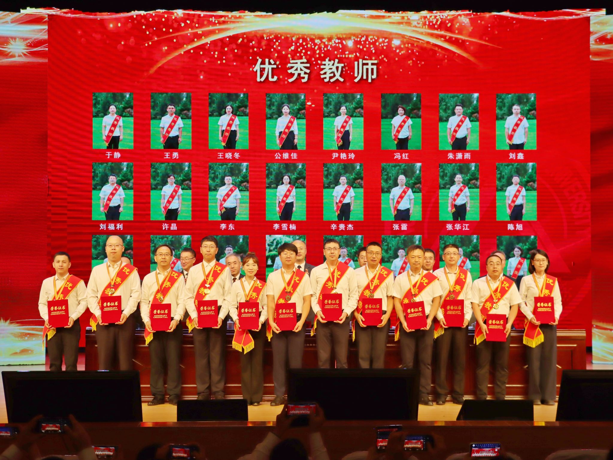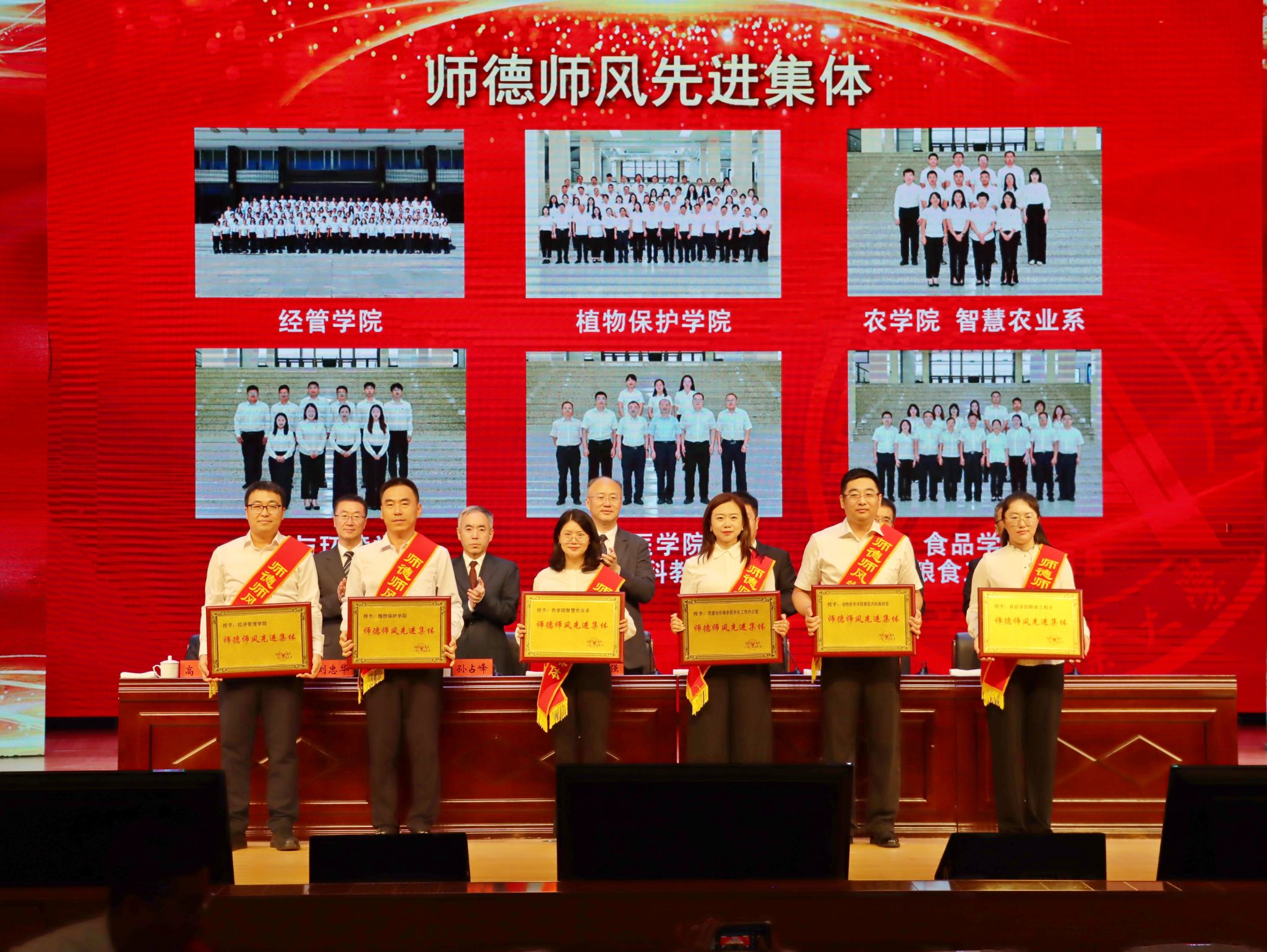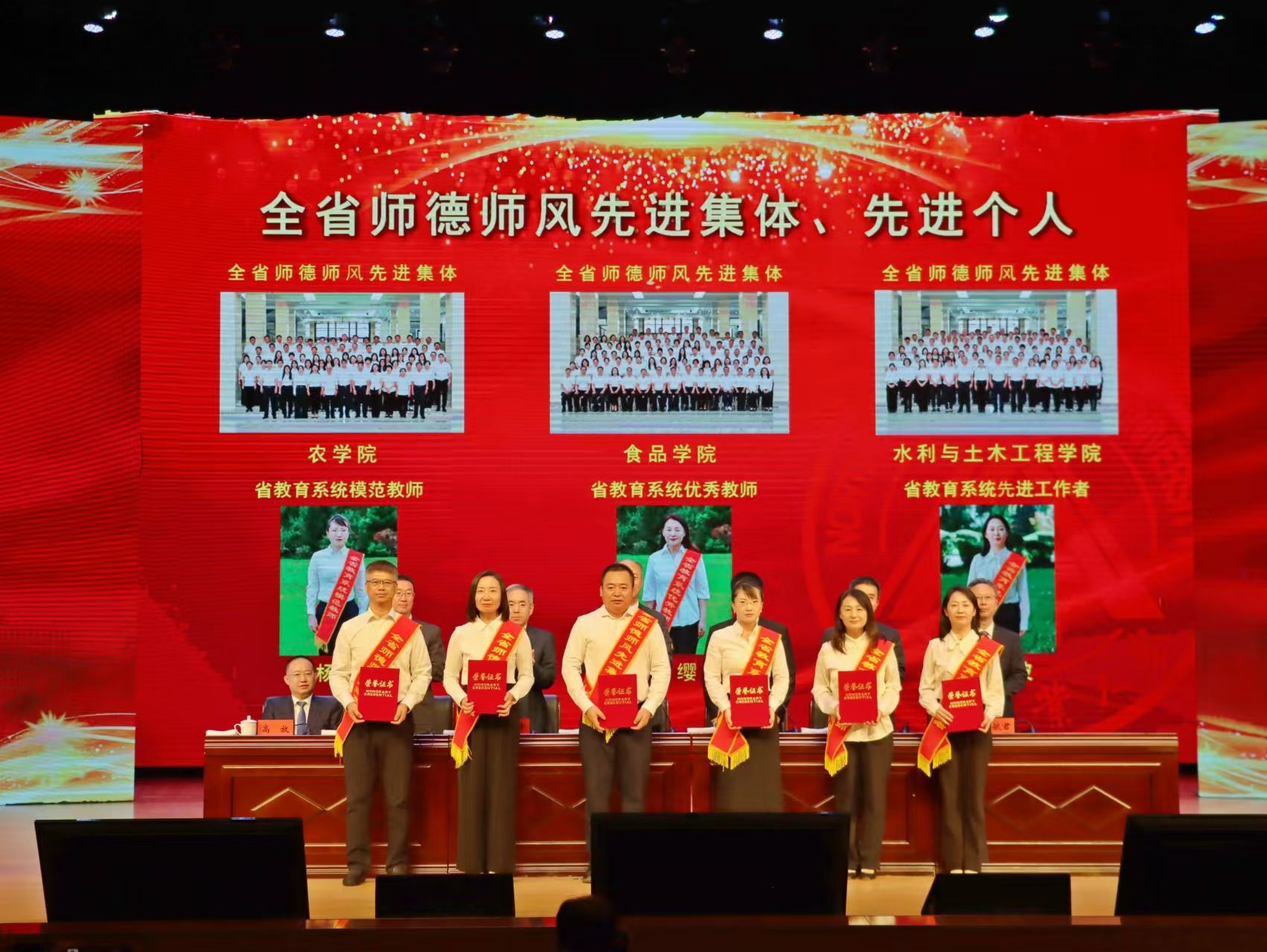 校领导为获奖单位及教职工颁奖。食品学院荣获“全国教育系统先进集体”称号;农学院、食品学院、水利与土木工程学院荣获“省师德先进集体”称号;姜毓君、李辉、武卉昕获“省师德先进个人”称号;杨帆、常缨、许静波分别荣获“省教育系统模范教师”“省教育系统优秀教师”“省教育系统先进工作者”称号;6个集体获“师德师风先进集体”称号;19人荣获“突出贡献奖”称号;24人荣获“优秀教师”称号;17人荣获“师德师风先进个人”称号,20人荣获“优秀教育工作者”称号,45名从教三十年教职工受到表彰。