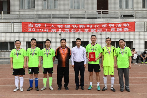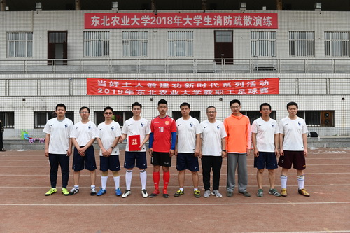 5月17日中午,我校2019年教职工足球赛决赛在南区体育场开赛,党政机关代表队和后勤处代表队为现场观众上演了一场精彩的冠军争夺战。比赛中,两队队员顶住压力,沉着应对,比分交替攀升。比赛用时结束时,战成2:2平局,经过紧张而又悬念跌宕起伏的点球大战,后勤处代表队最终获得了冠军。“2019年东北农业大学教职工足球赛”圆满结束。
