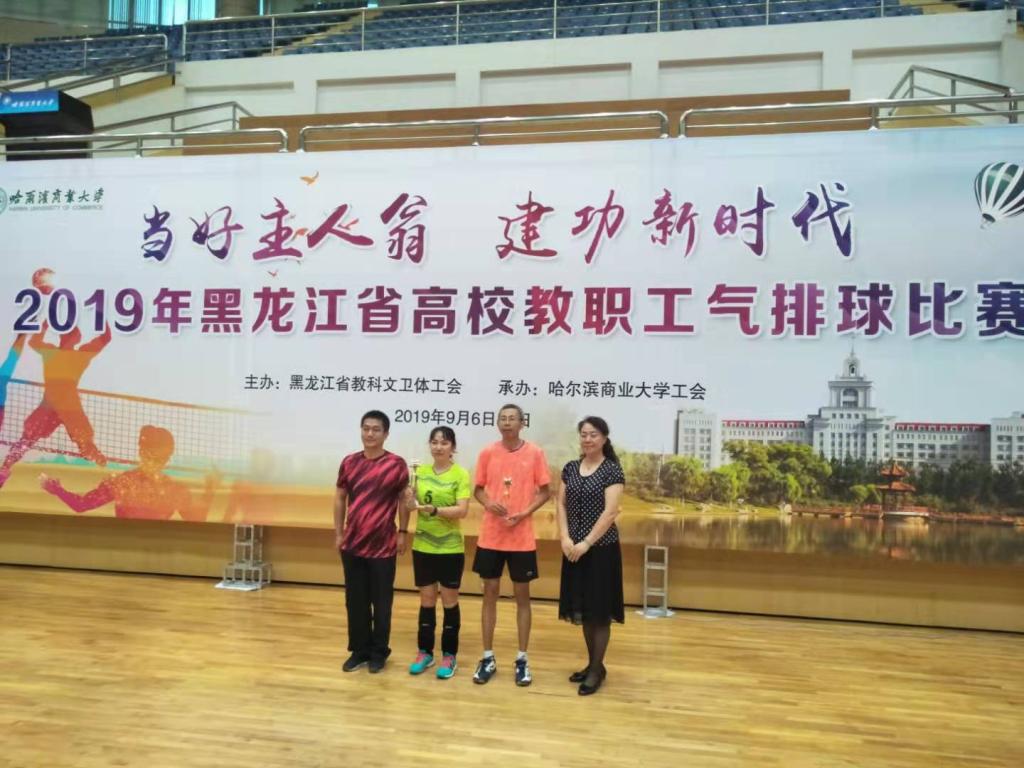 近日,由黑龙江省教科文卫体工会主办的“当好主人翁 建功新时代”2019年黑龙江省高校教职工气排球比赛暨全国比赛选拔赛在哈尔滨商业大学体育馆举行。我校派出男女两支教职工队伍代表队参赛。校党委常委、工会主席解宗军,工会副主席(正处级)孙永刚,副主席李巍参加了开幕式,为我校参赛队伍加油助威。
