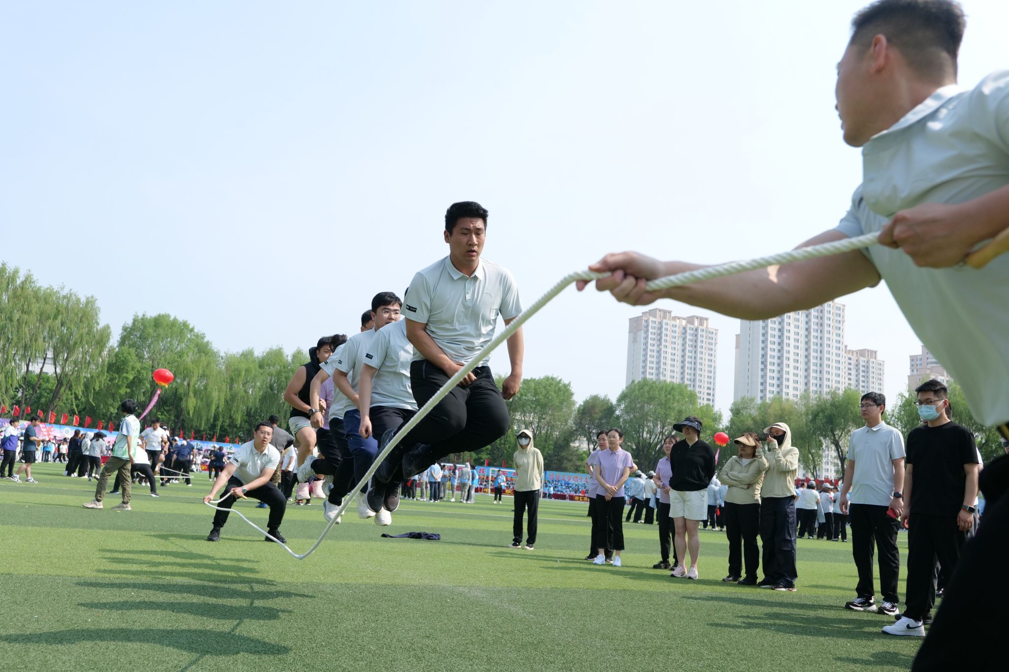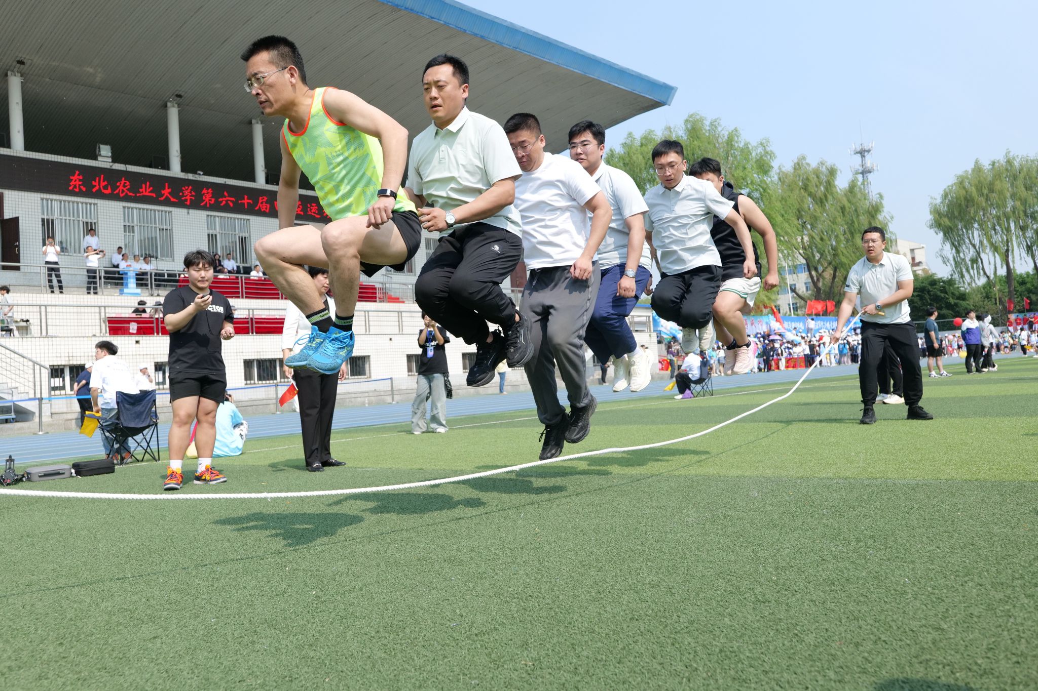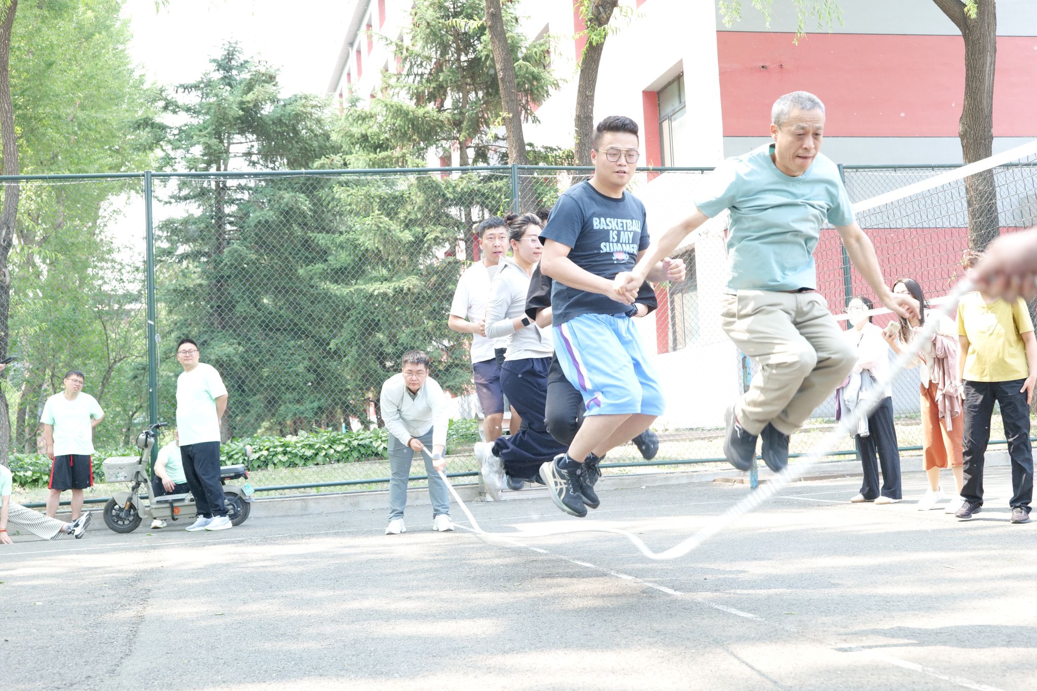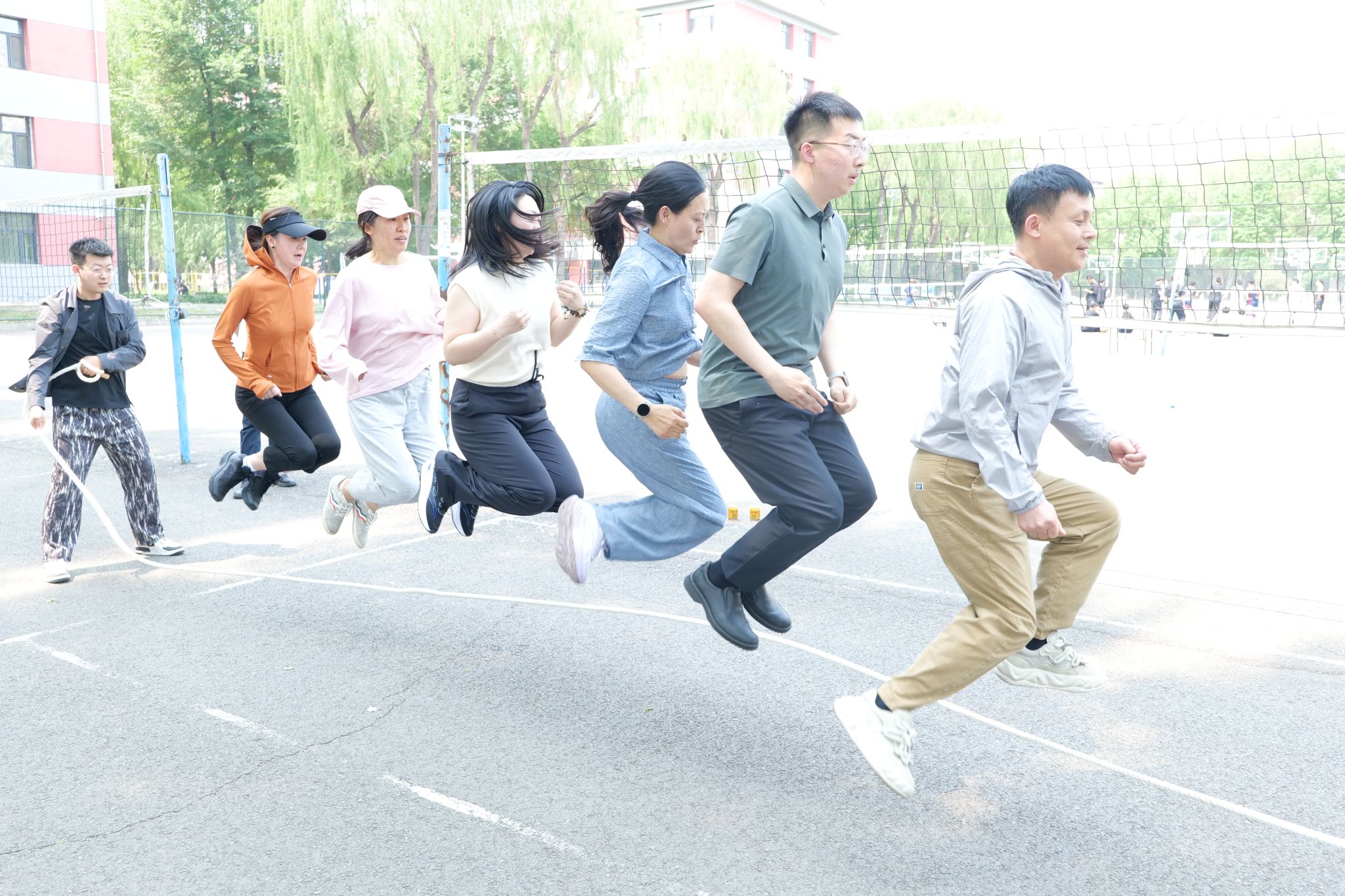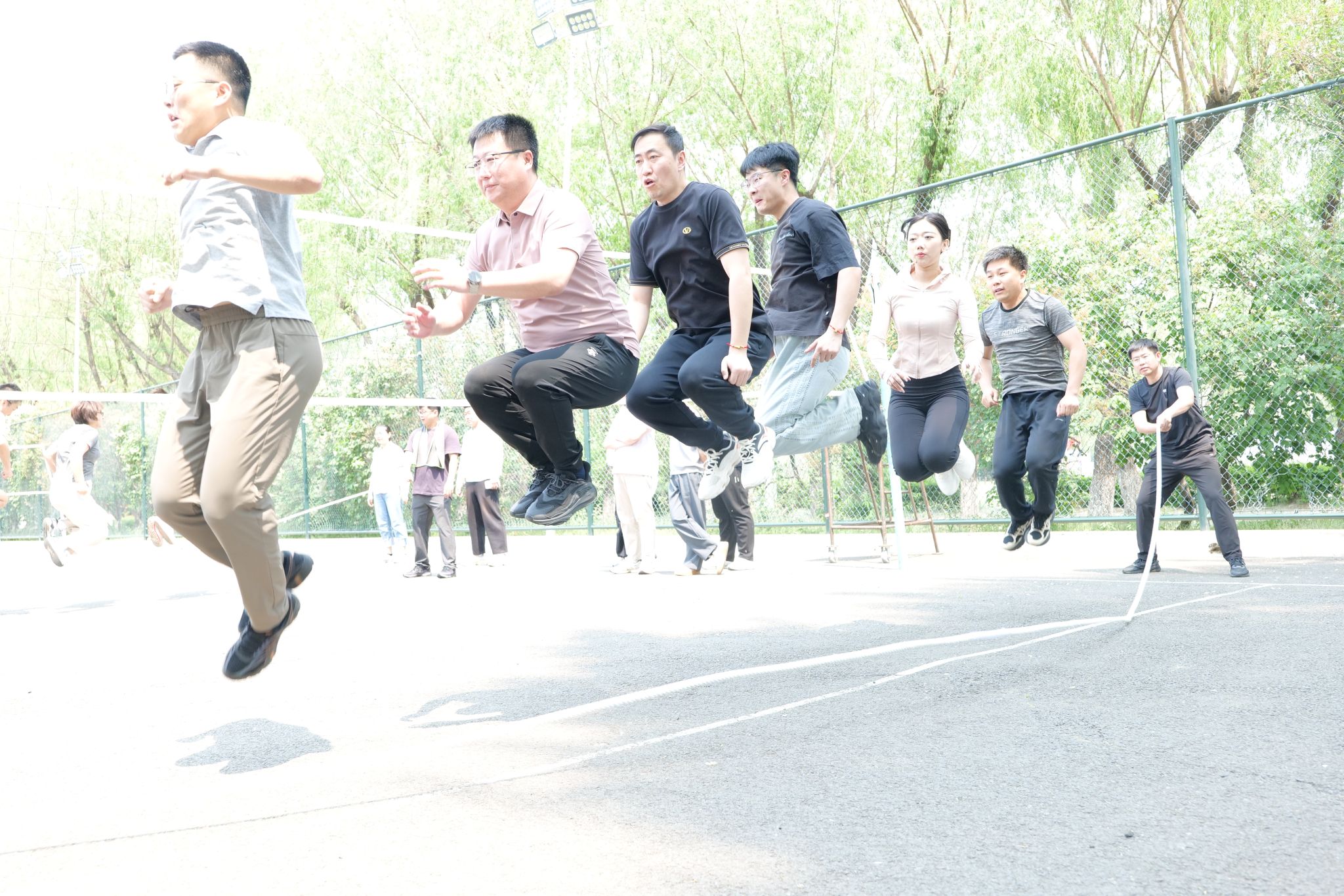 5月28日中午,比赛初赛在学校南区排球场举行。经过激烈比拼,食品学院、图书馆、水利与土木工程学院、后勤管理处、生命科学学院和继续教育学院6支队伍脱颖而出,成功晋级决赛。这些队伍在比赛中展现了出色的团队协作和跳绳技巧,赢得了现场观众的阵阵掌声。
